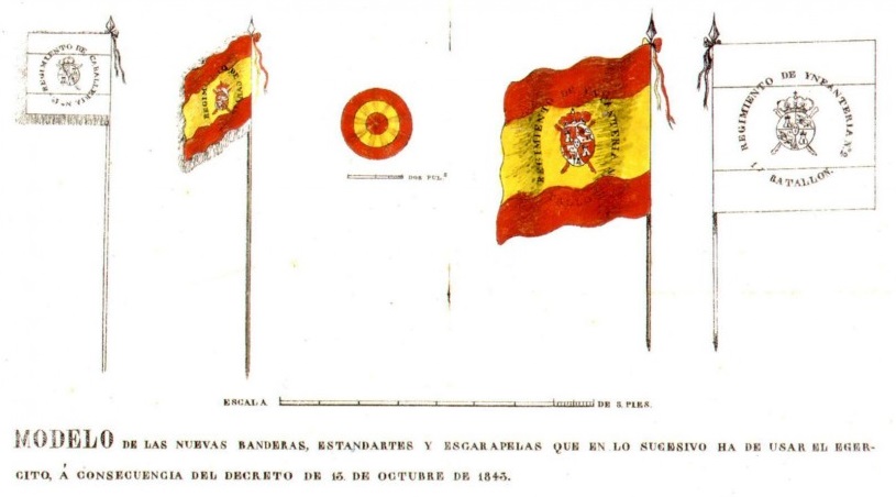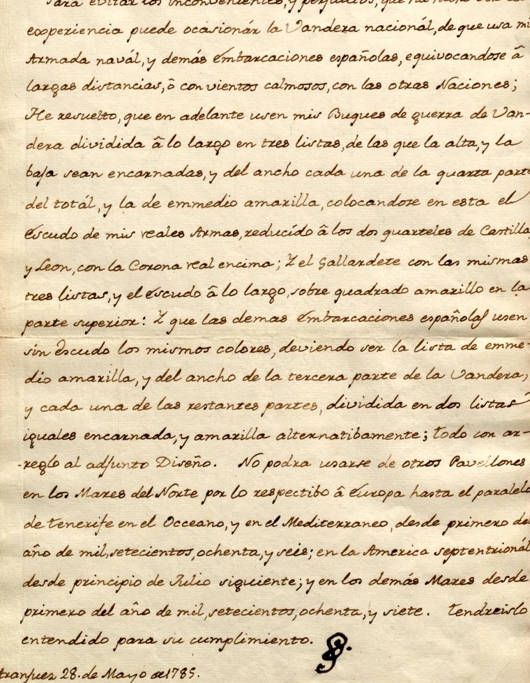Finalmente, mediante el Real Decreto de 28 de mayo de 1785, Carlos III dispuso una nueva bandera de guerra: «Para evitar los inconvenientes, y perjuicios, que ha hecho ver la experiencia puede ocasionar la Bandera nacional, de que usa mi Armada naval, y demas Embarcaciones Españolas, equivocándose á largas distancias, ó con vientos calmosos con las de otras Naciones; he resuelto, que en adelante usen mis Buques de guerra de Bandera dividida á lo largo en tres listas, de las que la alta, y la baxa sean encarnadas, y del ancho cada una de la quarta parte del total, y la de en medio amarilla, colocándose en esta el Escudo de mis Reales Armas reducido á los dos quarteles de Castilla, y Leon con la Corona Real encima; y el Gallardete con las mismas tres listas, y el Escudo á lo largo, sobre quadrado amarillo en la parte superior: Y de las demas Embarcaciones usen, sin Escudo, los mismos colores, debiendo ser la lista de en medio amarilla, y del ancho de la tercera parte de la Bandera, y cada una de las restantes partes dividida en dos listas iguales encarnada, y amarilla alternativamente, todo con arreglo al adjunto diseño. No podrá usarse de otros pavellones en los Mares del Norte por lo respectivo á Europa hasta el paralelo de Tenerife en el Océano, y en el Mediterraneo desde primero del año de mil setecientos ochenta y seis: en la América Septentrional desde principio de Julio siguiente; y en los demas Mares desde primero del año de mil setecientos ochenta y siete. Tendréislo entendido para su cumplimiento. Señalado de mano de S.M. en Aranjuez á veinte y ocho de Mayo de mil setecientos ochenta y cinco. A D. Antonio Valdés.»