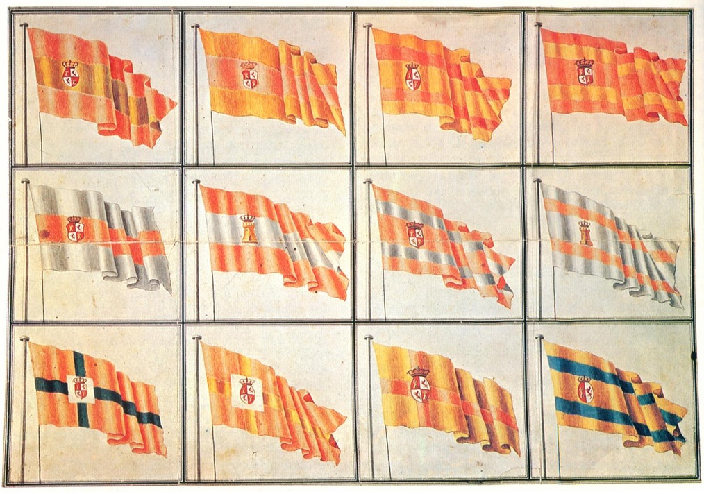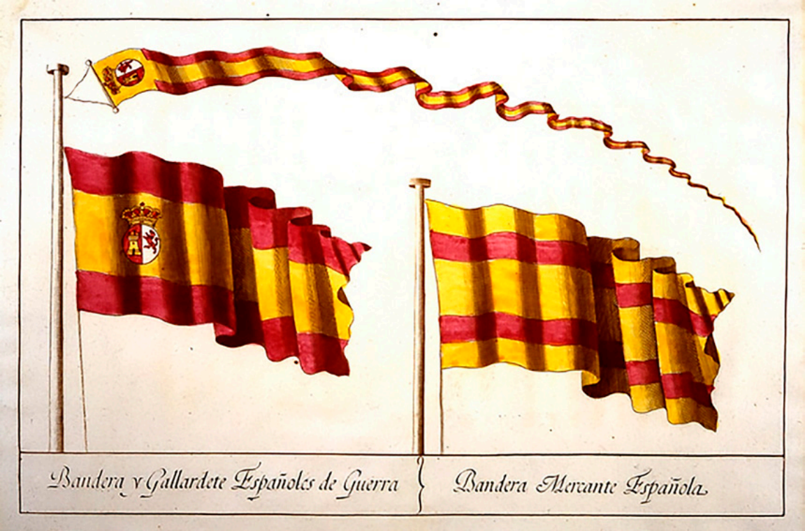 — Bandera y gallardete de guerra de España, así como bandera mercante (1785) Fuente: Archivo Histórico de la Armada