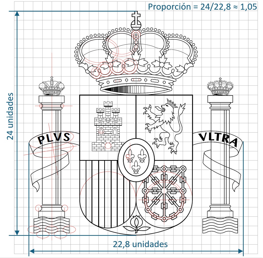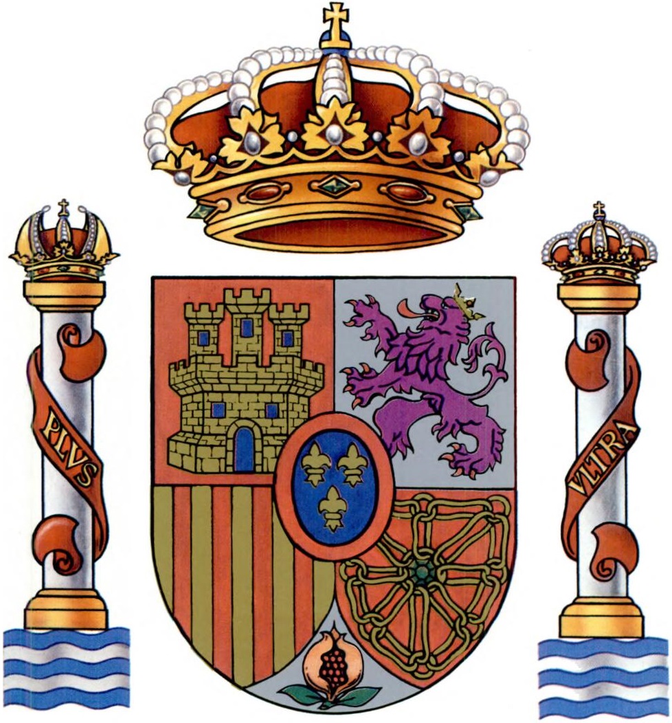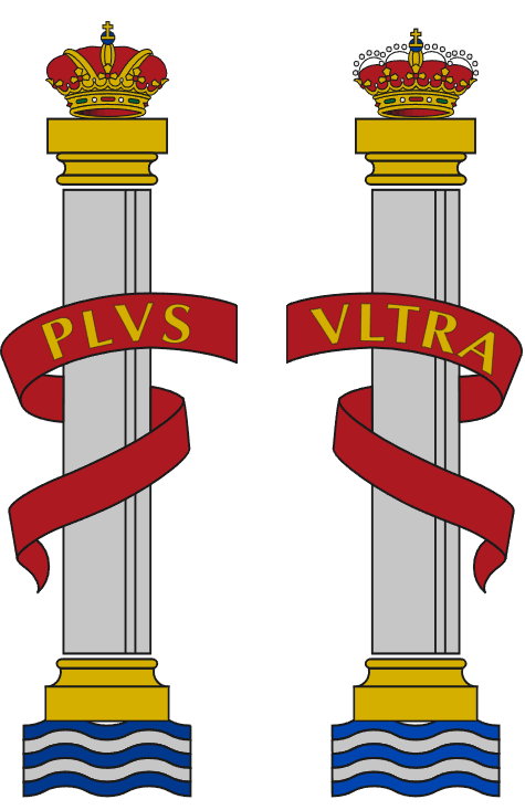 Según la mitología griega, Hércules colocó dos columnas en el estrecho de Gibraltar para marcar el límite del mundo conocido, considerado como el fin del Mediterráneo e inicio del vasto e ignoto Océano Atlántico. En esas dos columnas figuraba la inscripción «NON PLUS ULTRA» («No más allá», en latín). La adopción del lema «PLUS ULTRA» durante el reinado de Carlos I, a raíz del descubrimiento de América, fue un acto en cierta forma mitificador, negando la creencia anterior y simbolizando el imperio y las posesiones ultramarinas. Como ya se ha comentado en bloques anteriores, Carlos I añadió las columnas a su escudo, las cuales estaban rodeadas por unas cintas en las que figuraba el referido lema. Con el transcurso del tiempo, este ornamento exterior se consolidó como parte integrante del escudo, manteniendo su presencia hasta la actualidad.
