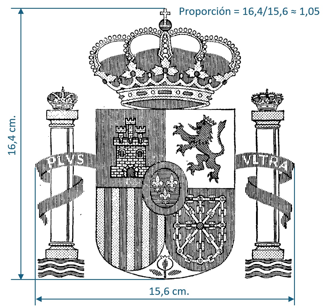 En cuanto a las dimensiones del escudo en la bandera, el Real Decreto en cuestión establece que su altura será de 2/5 (es decir, de un 40%) del ancho de la enseña, si bien deja sin definir el valor correspondiente a la anchura. No obstante, en el artículo primero de la norma aparece insertado el modelo oficial del escudo, del que se puede inferir una proporción altura-anchura de aproximadamente 1,05. Esta proporción coincide con la que se deduce a partir de una parilla o cuadrícula para la construcción gráfica del escudo incluida en el Manual de Imagen Institucional (del que se dará mayor detalle en párrafos posteriores). Por tanto, partiendo de este dato y operando adecuamente, puede establecerse que la anchura del escudo será de aproximadamente 19/50 del ancho de la enseña.