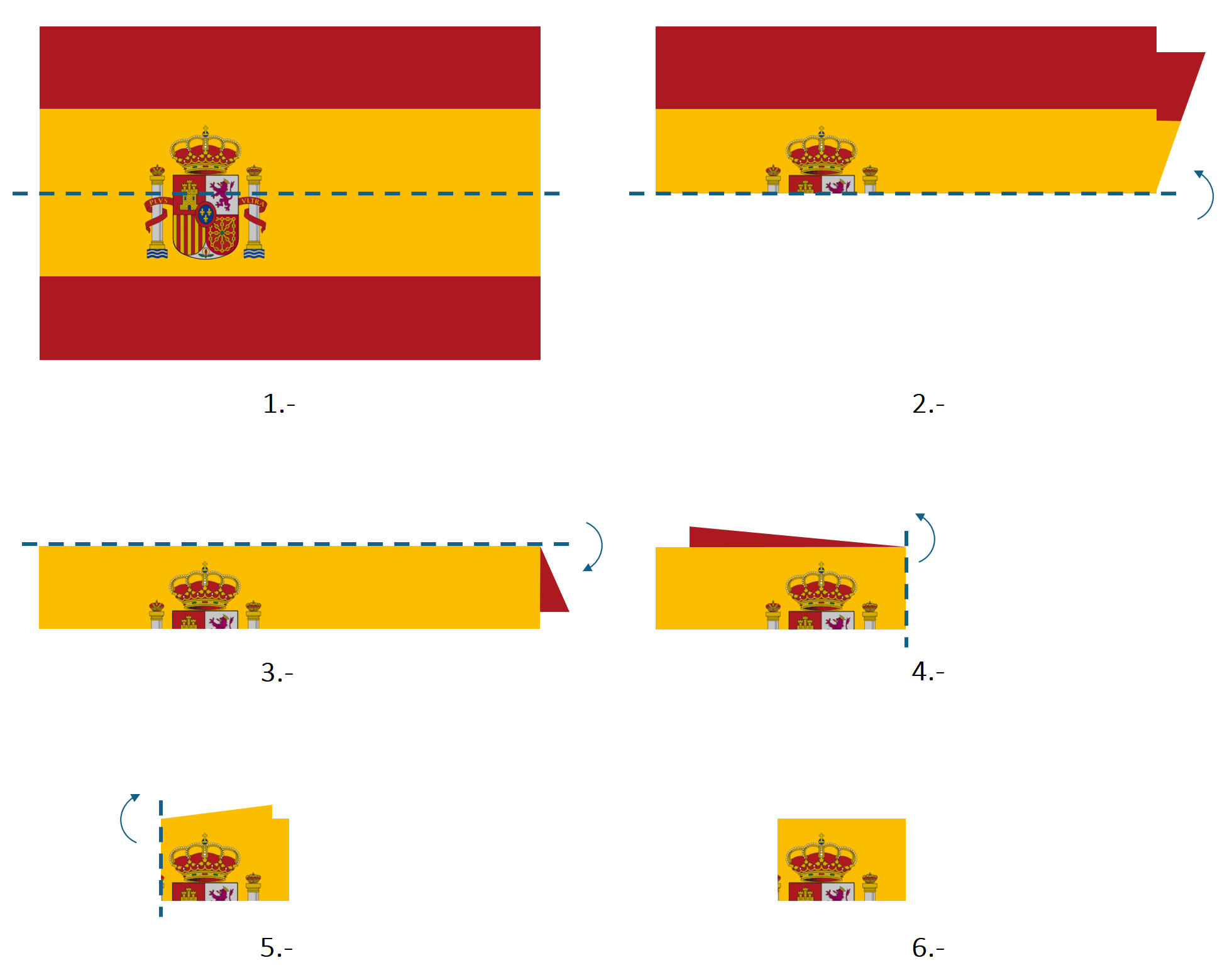 En lo que concierne al plegado de la bandera, aunque existen distintos procedimientos en función del caso concreto que se dé (arriado, honras fúnebres, etc.), suele llevarse a cabo de manera que la bandera quede presentada con el escudo visible.