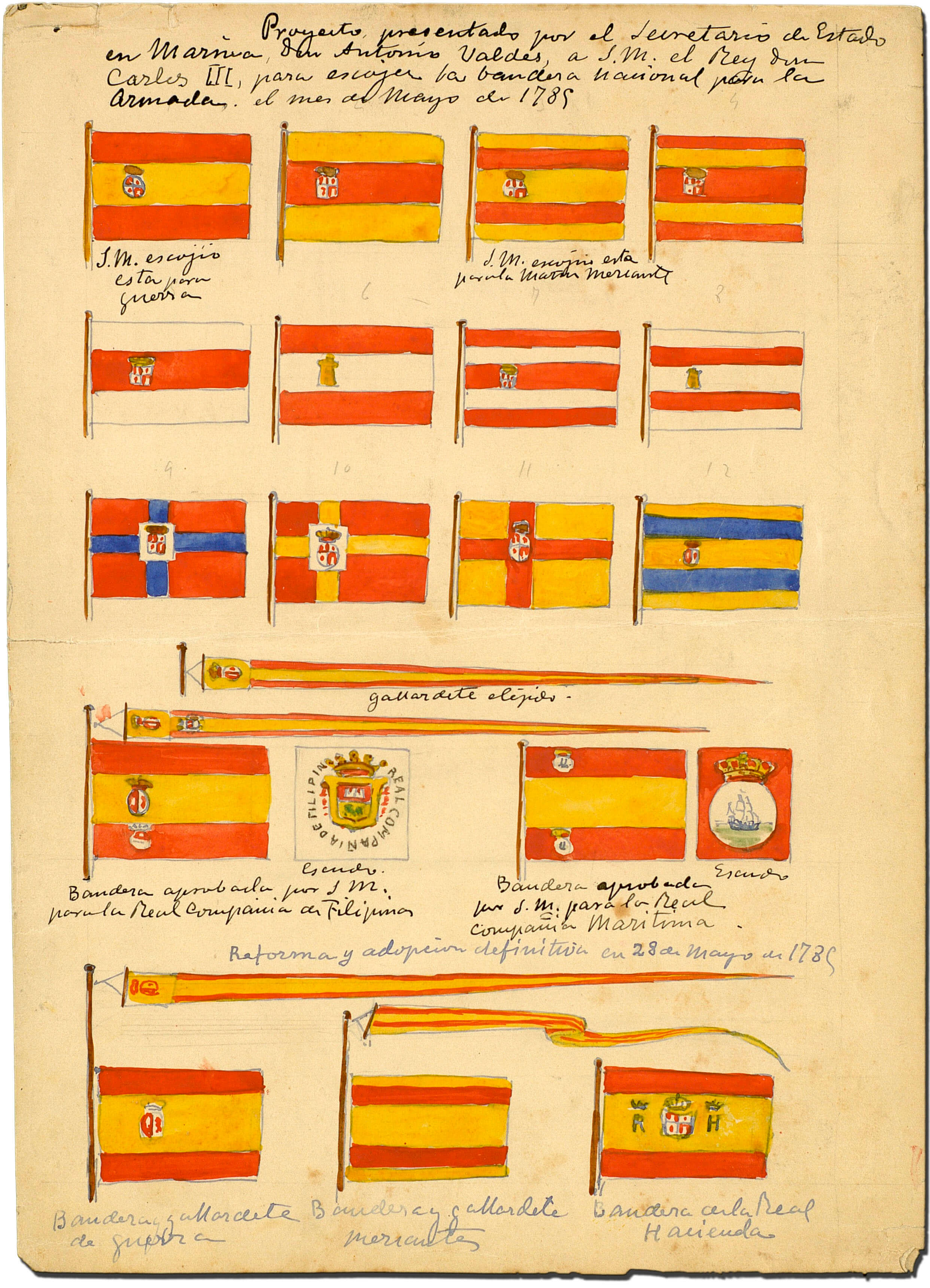 Ya durante el reinado de Carlos III, el monarca encargó a Antonio Valdés y Fernández Bazán, por entonces secretario de Estado y del Despacho Universal de Marina, el diseño de una nueva bandera para la Armada, de fácil identificación, esto es, que no se confundiera con el velamen, que se distinguiera de los colores del cielo y de la mar, que se apreciara con meteorología desfavorable y que no se confundiera con las de otras naciones.